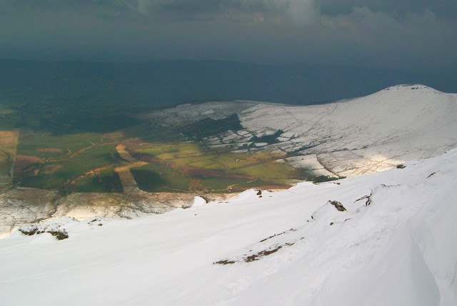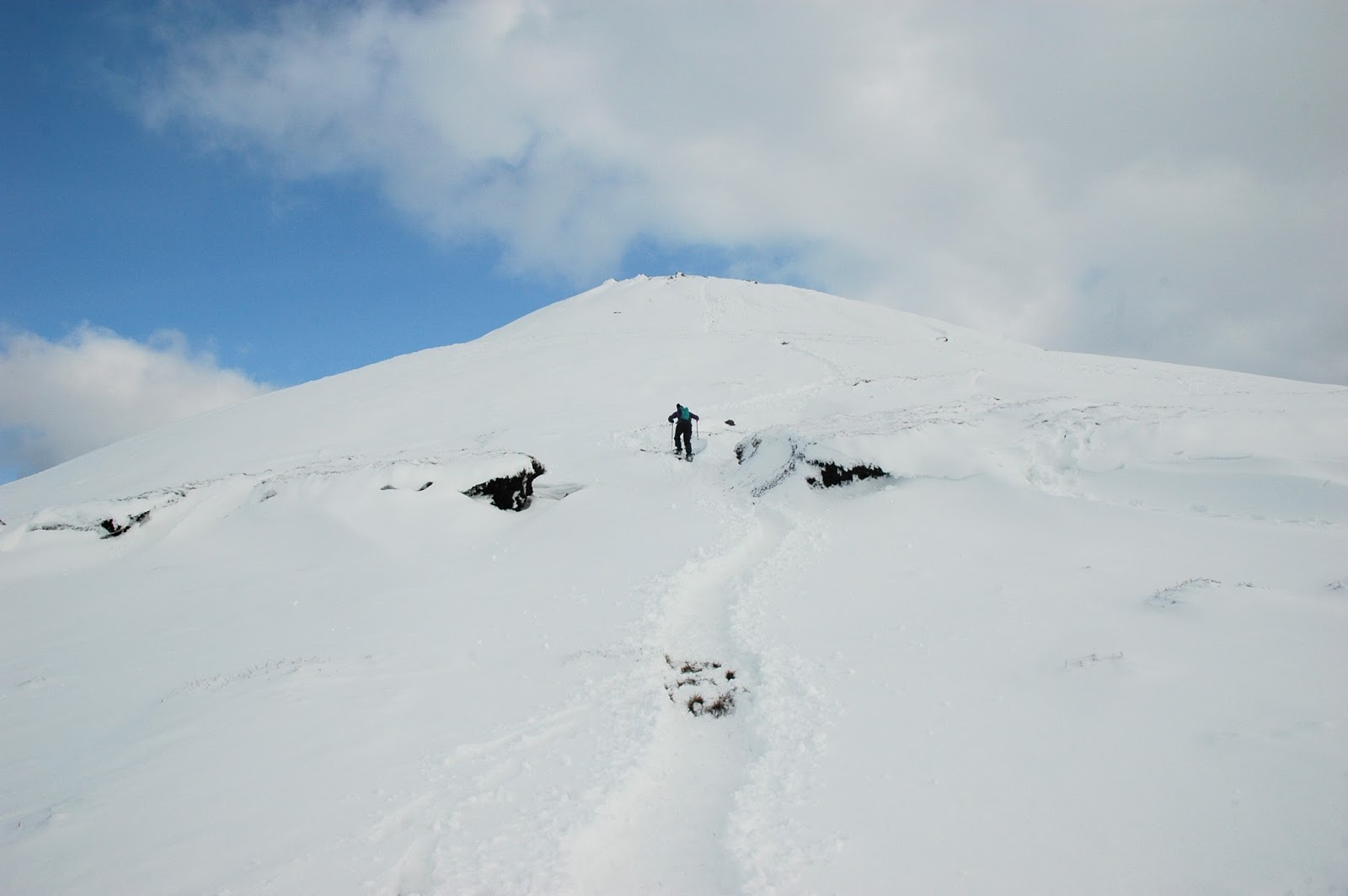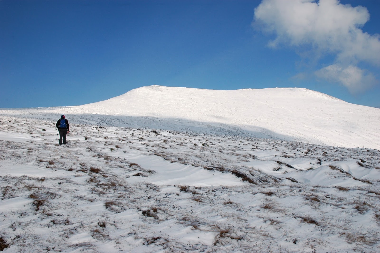 The conditions underfoot today were tough with knee deep snow in places and hidden holes full of snow close to the ridge. After turning right to the summit the path was well traveled and quite easy to follow but slippy in places. Real winter conditions, cold and dry with wind chill making you feel like in different world. White and bright tops contrasting with green lands below and some dark clouds above making the scenery very dramatic and absolutely beautiful.