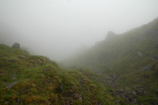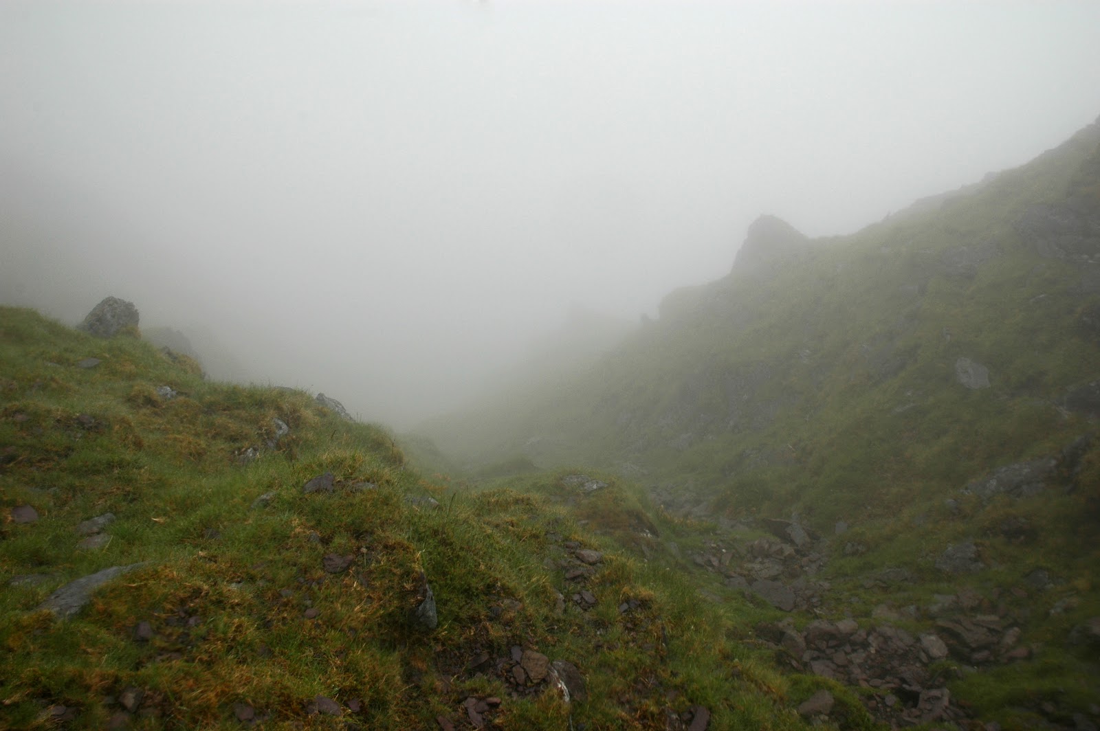 Off we went hoping for the clouds to clear later on. We climbed up Devil's Ladder quite fast and without any problems. We had our lunch on the top of the ladder and headed up Cnoc na Toinne. At this point one of the leaders started feeling a little bit unsure as the fog was thickening and winds getting stronger. At this point we should have used our escape route down the safe Zig-Zag route.